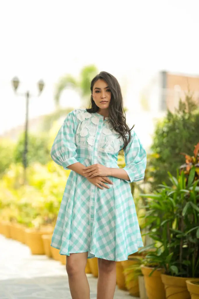 The Aura Mint Gingham Dress features a refreshing mint hue paired with a classic gingham pattern, creating a look that is both playful and refined. Its tailored silhouette flatters every body type, while thoughtful details ensu...