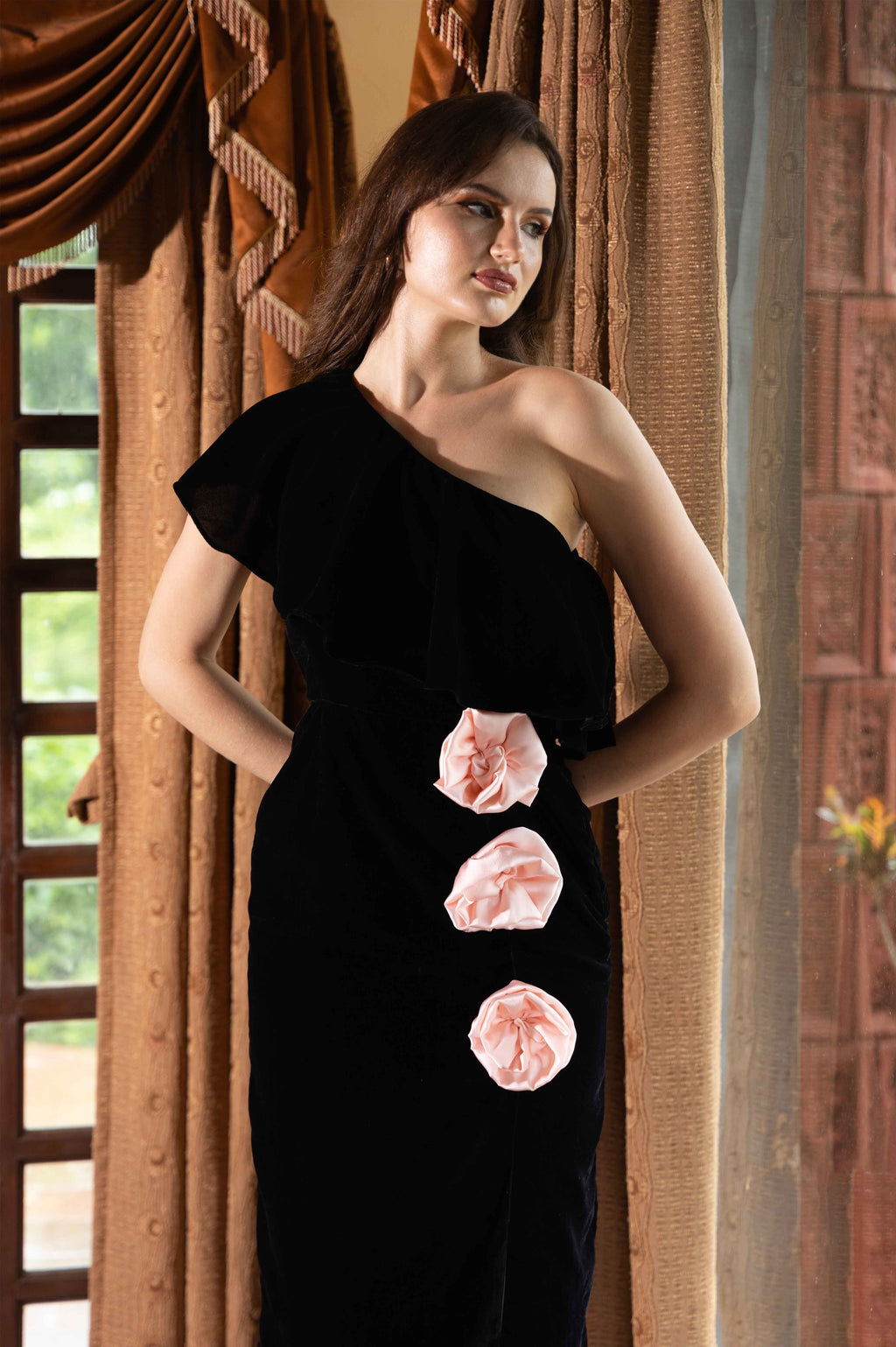 One shoulder ruffle Black velvet Midi length dress with satin Rose detailing in the front.This dress comes with Invisible zip closure and crepe lining.