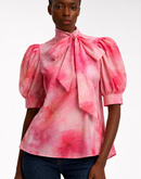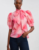 Soft, romantic, and undeniably elegant — this chiffon top in a dreamy rose quartz hue is designed to make a statement. Featuring a graceful bow-tie neckline and voluminous puff sleeves, it captures a refined vintage allure while remaining effortlessly modern. The fluid silhouette and delicate print make it perfect for elevated daywear and chic evening transitions.
