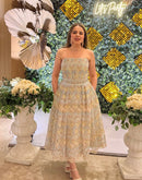 STRAPLESS EMBROIDERED CORSET POCKET MIDI DRESS